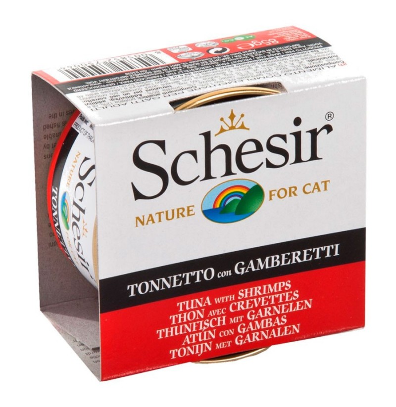 https://tienda.todomascota.es/gatos/15709-schesir-latas-atun-con-gambas-para-gatos-8005852750044.html#/cantidad-85g SCH0104 Schesir Latas Atún con Gambas en gelatina para gatos <h2>Schesir Lata de filetes de Atún con Gambas en gelatina para gatos</h2> <p>La receta se basa en <strong>auténticos filetes de delicioso atún</strong> combinados con <strong>gambas</strong>, pequeños crustáceos deliciosos de los que el paladar nunca se cansará. Viene en <strong>gelatina</strong> para satisfacer los gustos de los gatos que aman los sabores del mar combinados con una consistencia más sólida en el bol.</p> <p style="margin-top: 15px;"><strong>Características:</strong></p> <ul> <li>atún como primer ingrediente combinado con un sabroso aderezo de camarones</li> <li>Ingredientes 100% naturales</li> <li>Al vapor y artesanal</li> <li>Sin conservantes ni colorantes añadidos</li> <li>Con atún procedente de pesca sostenible</li> <li>Libre de crueldad</li> <li>Envases 100% reciclables (lata de aluminio; etiqueta de papel)</li> </ul> <p></p> <h3>Ingredientes</h3> <p>Atún 51%, camarones 6%, arroz 1,5%</p> <p></p> <p><strong>Componentes Analíticos:</strong></p> <p>Proteína 12%, grasa bruta 0,8%, fibra bruta 0,5%, ceniza bruta 1%, humedad 85%</p> https://tienda.todomascota.es/61490-large_default/schesir-latas-atun-con-gambas-para-gatos.jpg 1.8315 instock SCHESIR 2.035 1.665 10 0.1852018-08-02T19:36:34+0200/Gatos /Gatos/Alimentación para gatos /Gatos/Alimentación para gatos/Comida para gatos húmeda /Gatos/Alimentación para gatos/Schesir Húmedo gatos