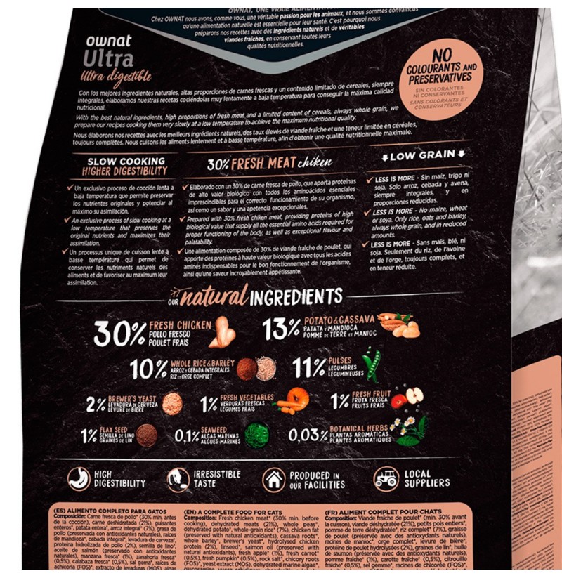 El pienso Ownat Ultra Chicken & Rice Cat de Pollo y Arroz es altamente digestible y apetecible. El gato disfrutará de un rico sabor y aroma gracias a los ingredientes naturales y su proceso de cocinado lento a baja temperatura.