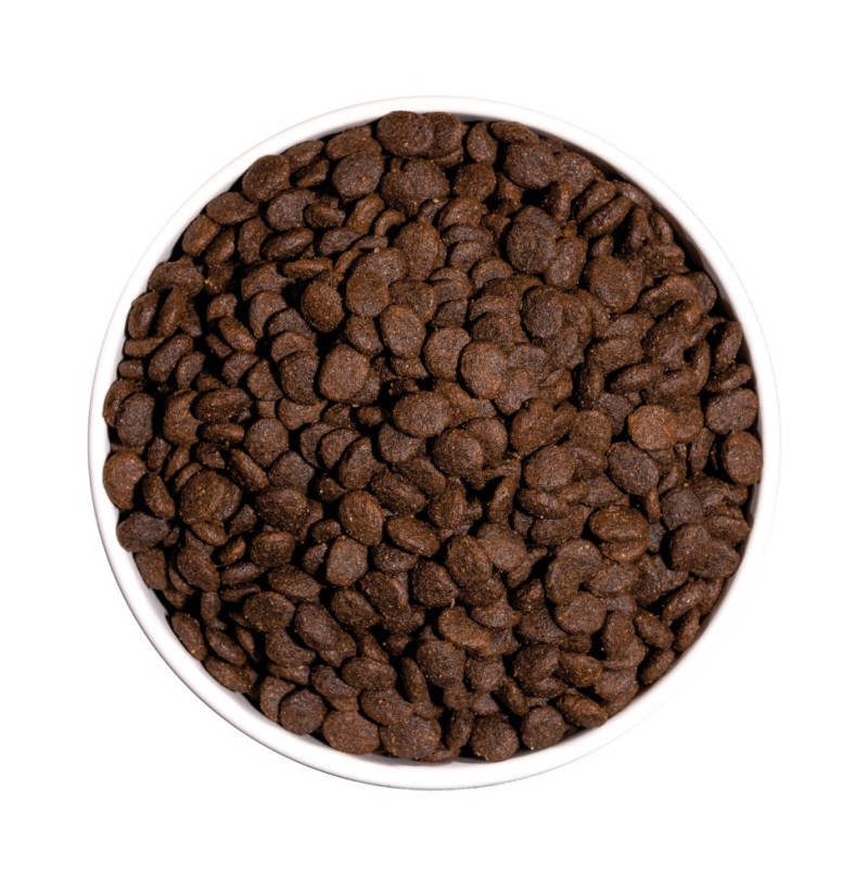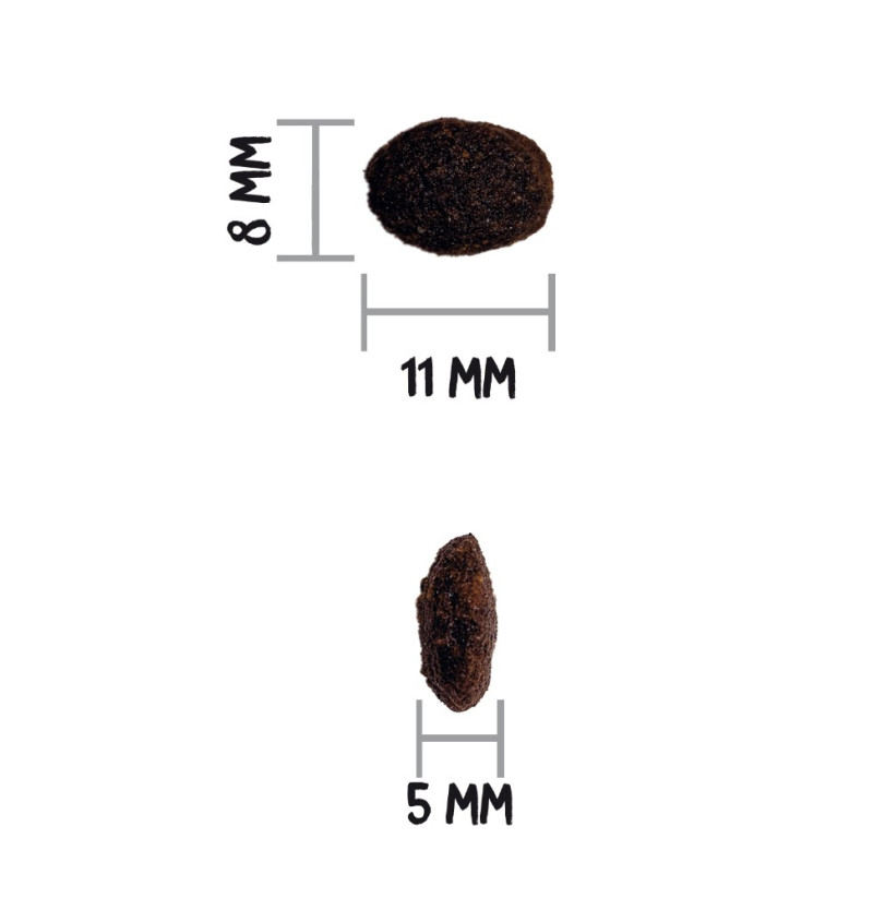 Proteína: 40%, contenido en grasa: 20%, fibras brutas: 3%, materia inorgánica: 8,5%, humedad: 8%, Omega 6: 3,6%, Omega 3: 0,65%, calcio: 1,4%, fósforo: 1%.