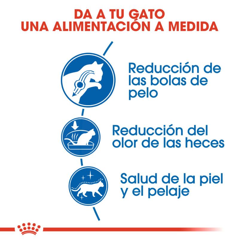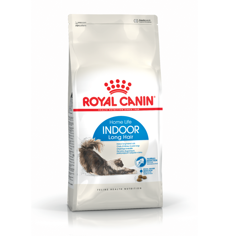 Los gatos adultos de interior, como el suyo, tienden a hacer menos ejercicio que los de exterior, por lo que una dieta equilibrada y completa que contenga nutrientes beneficiosos es importante para una salud óptima. Royal Canin Indoor 27 contiene una proteína (L.I.P.) específicamente seleccionada por su alta digestibilidad. Esta proteína también ayuda a reducir la cantidad de heces de su gato, así como a reducir el desagradable olor de las heces que se produce cuando los gatos tienen un tránsito intestinal más lento debido a la falta de ejercicio. Este alimento tiene un contenido moderado de grasa para garantizar que la ingesta de calorías de su gato esté en consonancia con su nivel de actividad; el contenido calórico también contribuye a mantener un peso saludable. Es habitual que los gatos de interior pasen largos periodos de tiempo acicalándose. Gracias a la inclusión de fibras dietéticas específicas, como el Psyllium, este alimento también ayuda a estimular la eliminación del pelo ingerido, lo que se traduce en una reducción significativa de la cantidad de bolas de pelo.