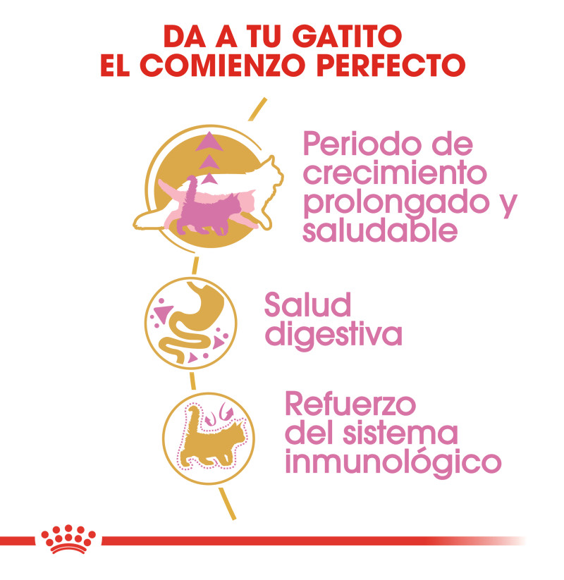 Maine Coon Kitten de Royal Canin ha sido específicamente formulado teniendo en cuenta las necesidades nutricionales de tu gatito. Una alimentación adecuada desde sus primeros días y a lo largo de su etapa de crecimiento hasta alcanzar la edad adulta, le ayudará a mantener su estado de salud a largo plazo. Aunque el sistema digestivo de tu gatito se está desarrollando, todavía es inmaduro. Por eso, necesita un alimento que aporte proteínas de alta calidad, que facilite su digestión. Contiene proteínas altamente digestibles conocidas como L.I.P. (del inglés Low Indigestible Proteins), así como prebióticos que equilibran su flora intestinal. A lo largo del periodo de crecimiento de tu Maine Coon, su sistema inmunológico se está desarrollando. Aporta un complejo antioxidante patentado (que incluye la vitamina E) que ayuda a reforzar sus defensas naturales.