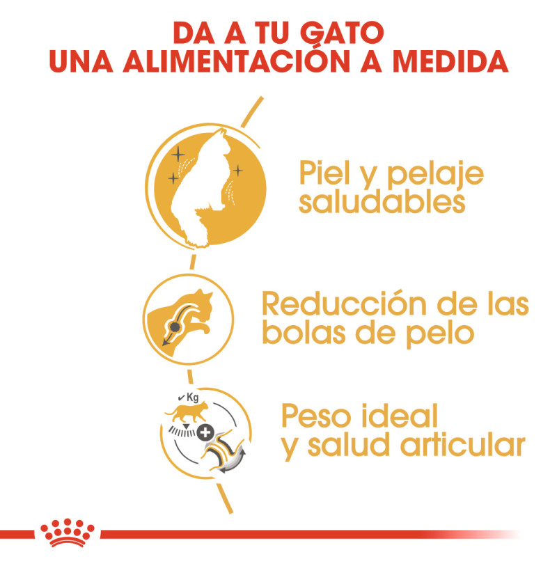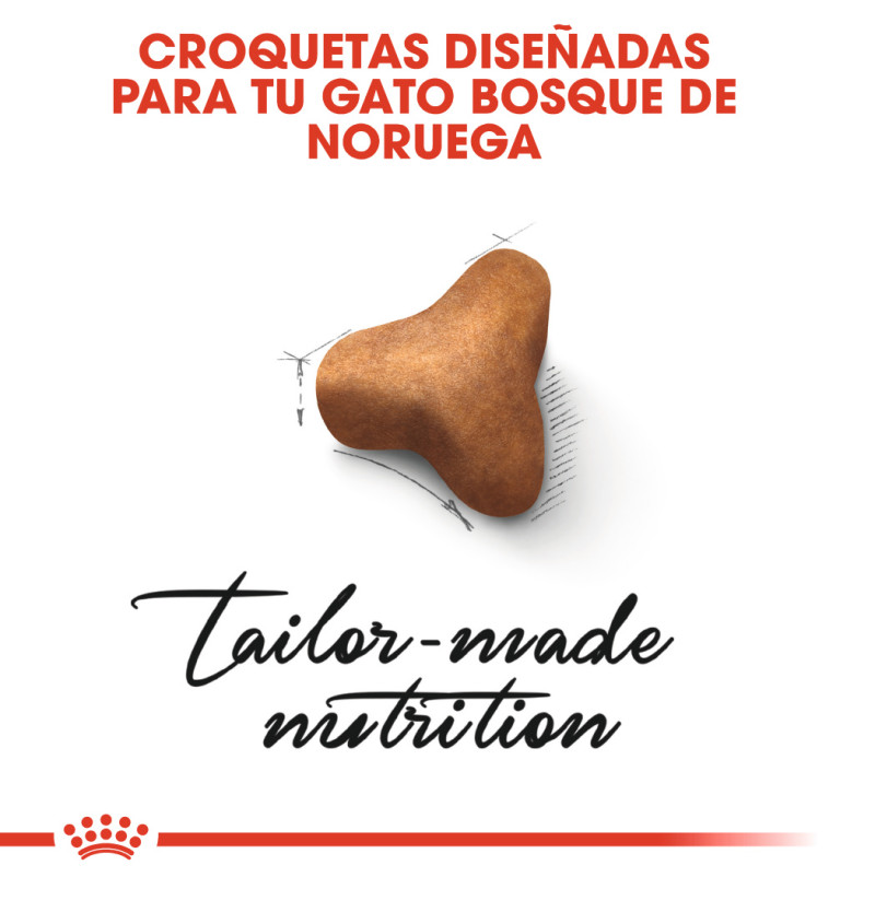 Norwegian Forest Cat Adult de Royal Canin ha sido formulado teniendo en cuenta las necesidades específicas de los gatos de raza Bosque de Noruega. Su croqueta en forma de estrella de tres puntas específicamente diseñada está adaptada a la fuerte mandíbula de los gatos de raza Bosque de Noruega y estimula la masticación reduciendo la velocidad de ingestión. Una combinación específica de fibras ayuda a estimular de forma natural su tránsito, así como a reducir y controlar la formación de bolas de pelo. El denso pelaje del Bosque de Noruega consiste en una capa de pelo superior, repelente al agua, y un denso subpelo lanoso que le sirve de aislamiento. El exclusivo complejo de nutrientes ayudan a reforzar la función barrera de la piel manteniendo la salud de la piel y el buen estado del pelo. La fórmula adaptada del alimento ayuda al mantenimiento del peso ideal y favorece la salud osteoarticular. Está enriquecido con L-carnitina, nutriente que participa en la metabolización de las grasas.