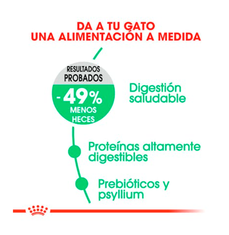 Un estómago y tracto digestivo sensibles pueden tener como resultado una gran cantidad de heces de mala calidad que también puede indicar una mala digestión. Royal Canin Cat Digestive Care ha sido formulado de una forma equilibrada y precisa para favorecer la salud digestiva gracias a sus nutrientes específicos y al diseño único de su croqueta. Aporta proteínas altamente digestibles (L.I.P.) para facilitar la digestión de tu gato, lo que favorecerá su estado de salud general. Esta alimentación se basa en una mezcla específica de prebióticos y fibras (entre las que se incluye psyllium) para favorecer el equilibrio de la flora intestinal y regular el tránsito intestinal. Aporta un elevado porcentaje de proteínas de alta calidad para mantener la musculatura de tu gato, así como para mejorar la calidad de las heces, reduciendo la frecuencia de las deposiciones. Además, la croqueta en forma de anillo ayuda a que el gato ingiera más lentamente y mastique bien para una buena digestión.