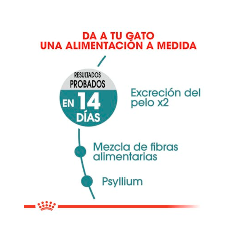 Con frecuencia, los gatos pasan una gran parte de su día aseándose, lo que puede provocar la ingesta de grandes cantidades de pelo. Ese pelo ingerido puede llegar a compactarse en el tracto digestivo y provocar la formación de bolas de pelo que son regurgitadas o eliminadas a través de las heces. Hairball Care de Royal Canin está compuesto por una mezcla específica de fibra alimentaria, entre las que se incluye el psyllium (rico en mucílago), y fibras insolubles para ayudar a estimular el tránsito intestinal de forma natural. Como resultado, el pelo ingerido a diario puede eliminarse en las heces en lugar de acumularse en el estómago y regurgitarse. También incluye una combinación precisa de nutrientes con un alto contenido de proteínas (34 %) y de grasas (15 %) para garantizar que se mantiene de forma eficaz un aporte saludable de nutrientes. Se ha demostrado que el uso exclusivo de Hairball Care de Royal Canin es capaz de duplicar, en tan solo 14 días, la cantidad de pelo que se elimina de manera natural en las heces. Para adaptarse a las preferencias individuales de cada gato