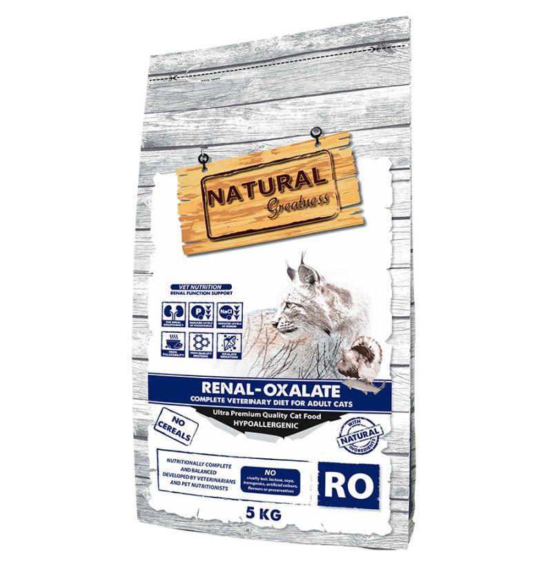 Natural Greatness renal-oxalate es un pienso destinado a gatos adultos que padecen insuficiencia renal crónica. Ayuda a evitar la reaparición de cálculos de oxalato. Además promueve el buen funcionamiento de la flora intestinal gracias a los prebióticos FOS y MOS.