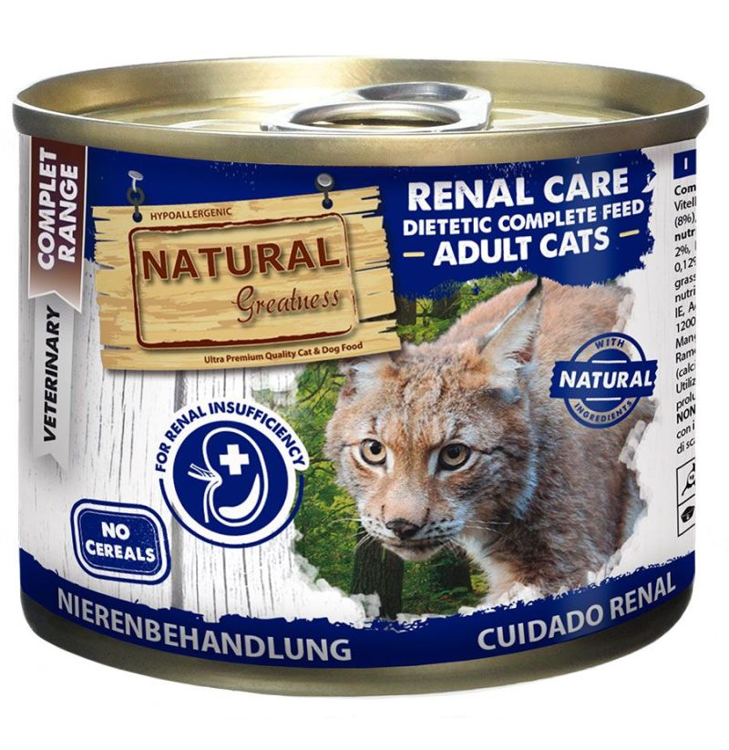 Alimento húmedo Natural Greatness renal care para gatos junior y adultos que tienen problemas de insuficiencia renal crónica y necesitan una dieta baja en proteínas y fósforo. Ayuda a evitar la reaparición de cálculos de oxalato y a la preservación de la función renal.