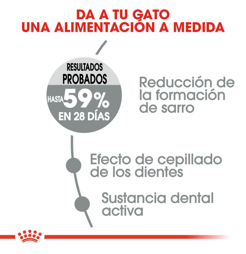 Oral Care de Royal Canin es una fórmula nutricional precisa y equilibrada que ayuda a mantener la salud oral de tu gato al reducir la formación de placa dental. También incluye un alto contenido de proteínas para favorecer y fortalecer los músculos, los huesos y los dientes de tu gato. Si estás buscando un alimento que aporte beneficios a los dientes y la cavidad oral de tu gato, es importante que sepas que lleva a cabo una doble acción: una acción mecánica y una acción química. Acción mecánica: la textura, forma y el tamaño de la croqueta estimula la masticación. Esta acción mecánica produce un efecto de cepillado dental diario que ayuda a reducir la formación de placa dental sobre los dientes. Acción química: esta fórmula también está enriquecida con un “agente dental activo” (quelantes de calcio) que atrapa el calcio de la saliva para ayudar a limitar la mineralización de la placa dental. Se ha demostrado clínicamente que el uso exclusivo de Oral Care de Royal Canin es capaz de ofrecer resultados en tan solo 28 días de uso continuo, y reduce hasta un 59 % la formación de sarro.