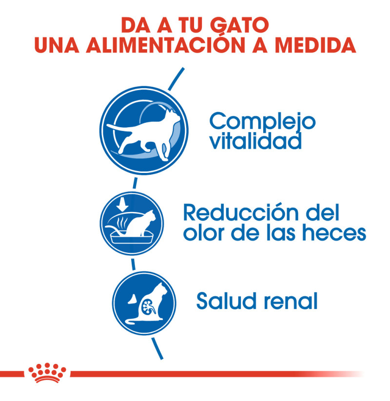 Cuando deben hacer frente a los primeros signos de la edad, los gatos adultos que viven dentro de casa como el tuyo necesitan una dieta completa y equilibrada, capaz de garantizar un estado de salud óptimo. Indoor 7+ de Royal Canin es un alimento adecuado para gatos de 7 años o más, que ha sido específicamente formulado teniendo en cuenta las necesidades nutricionales de los gatos adultos que viven dentro de casa, como el tuyo. Ha sido enriquecido con nutrientes específicos como, por ejemplo, polifenoles de té verde, vitamina C, EPA y DHA. Estos nutrientes aportan a tu gato la ayuda que necesita para hacer frente a los primeros signos del envejecimiento. Contiene proteínas específicas, seleccionadas por su alta digestibilidad (LIP). Estas proteínas altamente digestibles ayudan a reducir no solo la cantidad de heces, sino también el mal olor. Es importante que tu gato maduro reciba los nutrientes necesarios para favorecer el buen funcionamiento de su sistema urinario. Ha sido específicamente formulado para eso. Al favorecer y mantener su función urinaria, tu gato podrá enfrentarse cómodamente a los primeros signos del envejecimiento.