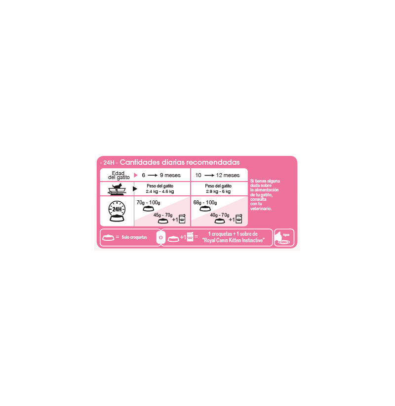 Royal Canin Kitten Sterilised está formulado especialmente para cubrir las necesidades nutricionales de los gatitos esterilizados durante la “fase de consolidación” de su crecimiento. Esta fórmula es adecuada para gatitos esterilizados de 6 a 12 meses de edad, un período de importantes cambios físicos y de comportamiento. Este alimento diseñado a medida cuenta con un contenido moderado de grasas para ayudar a reducir el riesgo de aumento de peso y, además, incluye niveles óptimos de proteínas, calcio y fósforo para un desarrollo saludable. También contiene nutrientes como vitaminas C y E, que contribuyen al desarrollo saludable del sistema inmunitario del gatito. Estos antioxidantes dietéticos han demostrado estimular un aumento más elevado y rápido de los anticuerpos tras la vacunación. También está enriquecido con un ácido graso omega-3 (DHA) para ayudar al desarrollo cerebral y promover una visión saludable. Gracias a una combinación de prebióticos beneficiosos (MOS) y proteínas de alta digestibilidad, también favorece el equilibrio saludable del microbioma (flora intestinal) y la salud digestiva. La croqueta está especialmente adaptada para la pequeña boca de tu gatito. Al masticar, se produce un efecto de cepillado que ayuda a mantener la salud dental de tu gatito. A los 12 meses de edad, tu gatito esterilizado necesitará un alimento que esté especialmente adaptado para cubrir sus necesidades nutricionales de gato adulto.