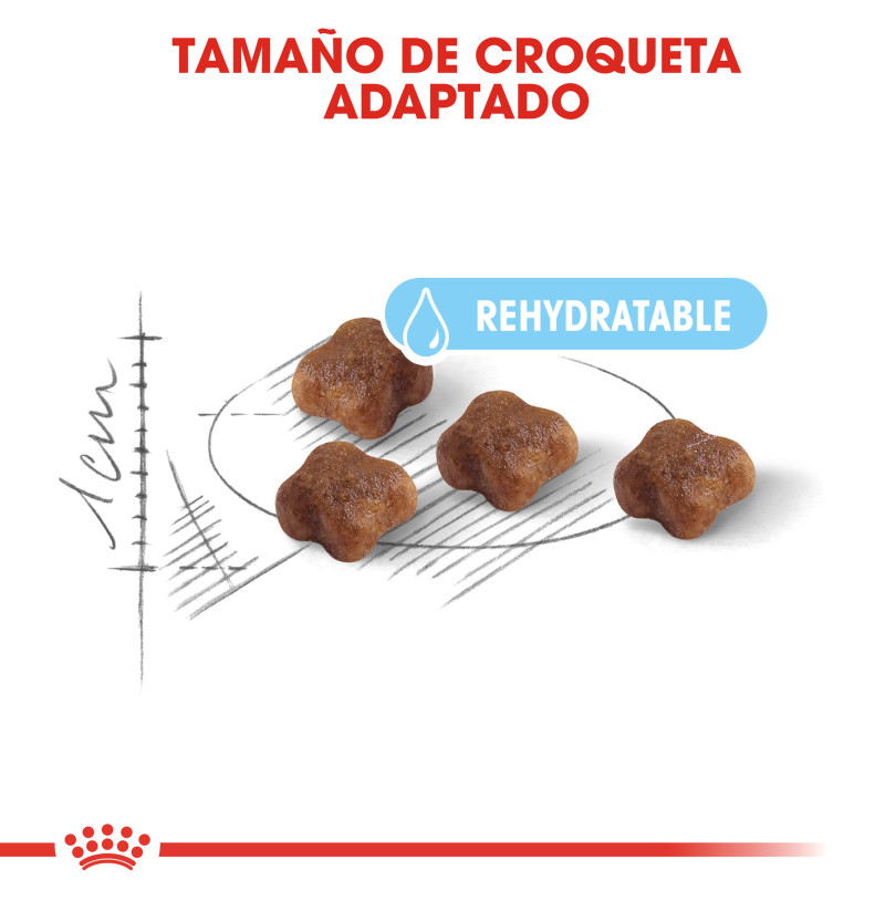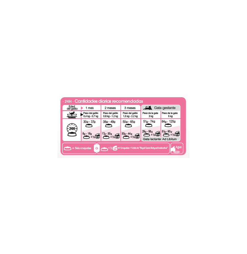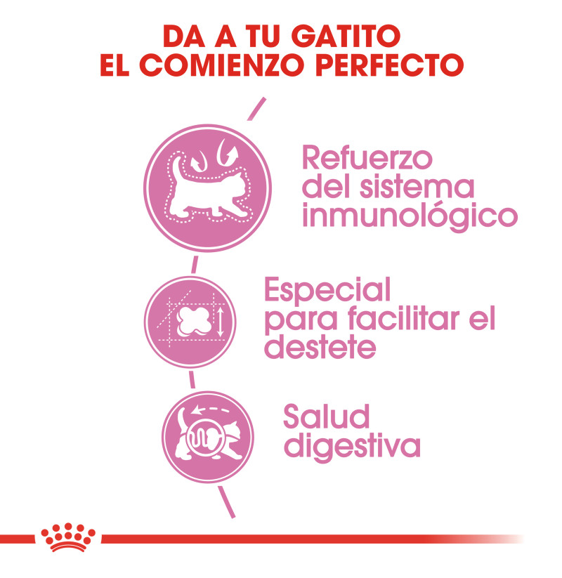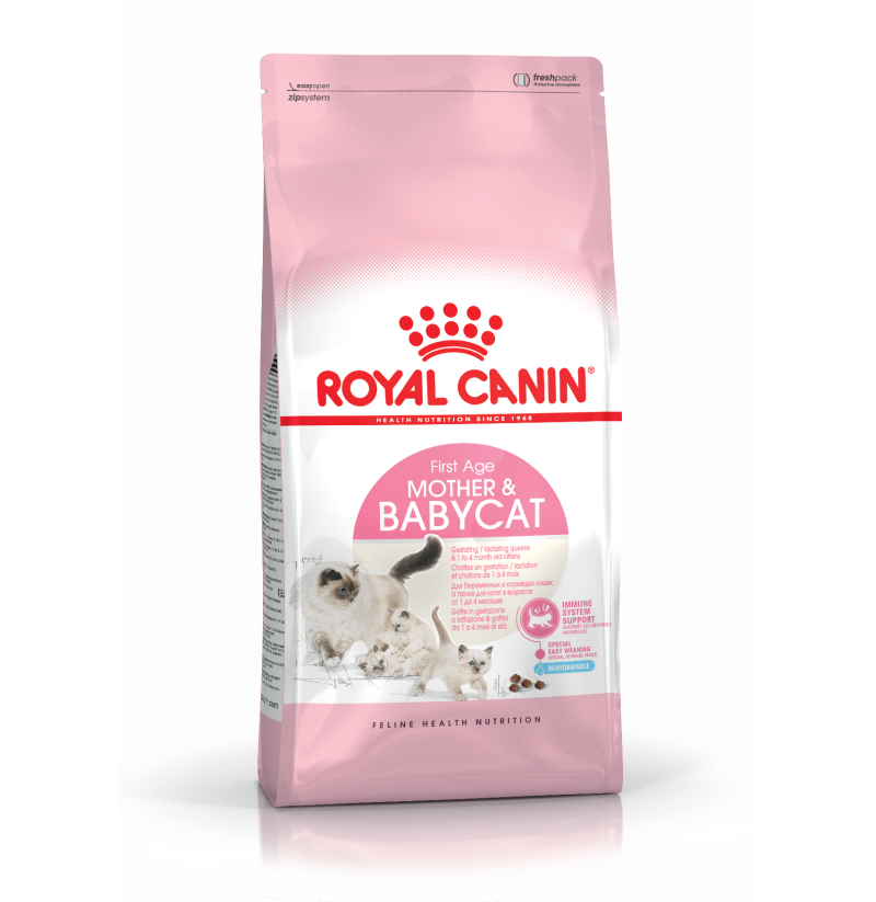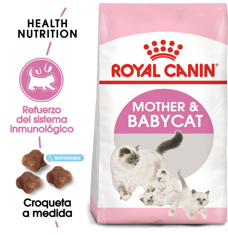 Royal Canin Mother & Babycat está especialmente adaptado para satisfacer las elevadas necesidades energéticas de tu gata al final de la gestación y durante la lactancia. También está formulada para favorecer un desarrollo saludable de los gatitos en periodo de destete y hasta los 4 meses de edad. Contiene un complejo probado que incluye vitaminas C y E para favorecer un desarrollo saludable del sistema inmunitario. Esta fórmula está enriquecida con un ácido graso omega-3 (DHA) para ayudar al desarrollo cerebral y promover una visión saludable de los pequeños gatitos. Gracias a una combinación de prebióticos beneficiosos (MOS) y proteínas de alta digestibilidad, también favorece el equilibrio saludable del microbioma (flora intestinal) y la salud digestiva. La croqueta es fácil de rehidratar con agua, consiguiendo una apetecible textura de papilla que es ideal para los gatitos en período de destete y contribuye a su hidratación. En el breve período de 4 meses, tus gatitos necesitarán un alimento que esté especialmente adaptado para satisfacer sus necesidades nutricionales durante la siguiente fase de crecimiento.
