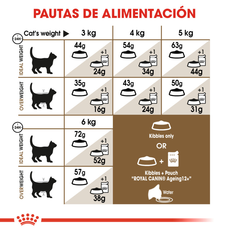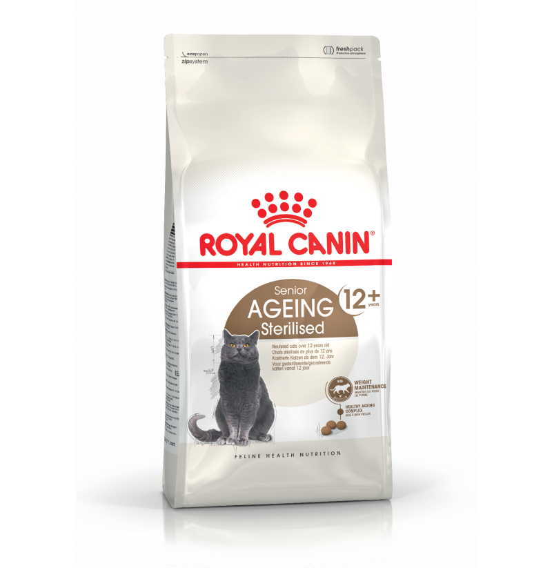Ageing Sterilised 12+ de Royal Canin ha sido especialmente formulado teniendo en cuenta las necesidades nutricionales de tu gato esterilizado de edad avanzada. Contiene un nivel moderado de grasas, para ayudarle a mantener una condición corporal ideal. Nuestro complejo favorecedor de un envejecimiento saludable contiene una composición patentada de antioxidantes, como licopeno y ácidos grasos omega 3, que favorecen la salud de las funciones corporales de tu gato durante toda la fase de envejecimiento. Gracias a un nivel adaptado de fósforo, también favorece su salud renal, ya que facilita el correcto funcionamiento de sus riñones. Para adaptarse a las preferencias individuales de cada gato,