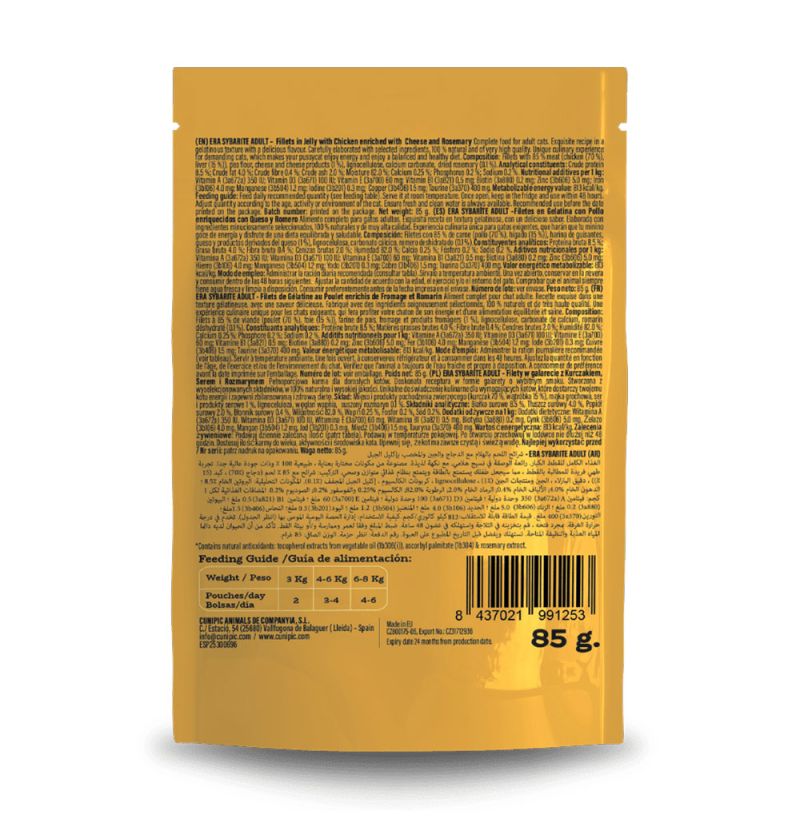 La comida húmeda Era Sybarite de Pollo con Queso es un alimento perfecto para gatos adultos de todas las razas. La receta esta elaborada con un 85% de carne fresca, proporcionando una alta palatabilidad y un gran valor biológico. Está realizado con ingredientes seleccionados, 100% naturales y de alta calidad. Contiene ingredientes funcionales como el queso que es un gran fuente de proteínas de origen animal, a demás de aportar calcio, magnesio y fósforo. También contiene Romero que sirve como anti-bactericida, gracias a su efecto antiséptico y grandes cualidades anti-inflamatorias.