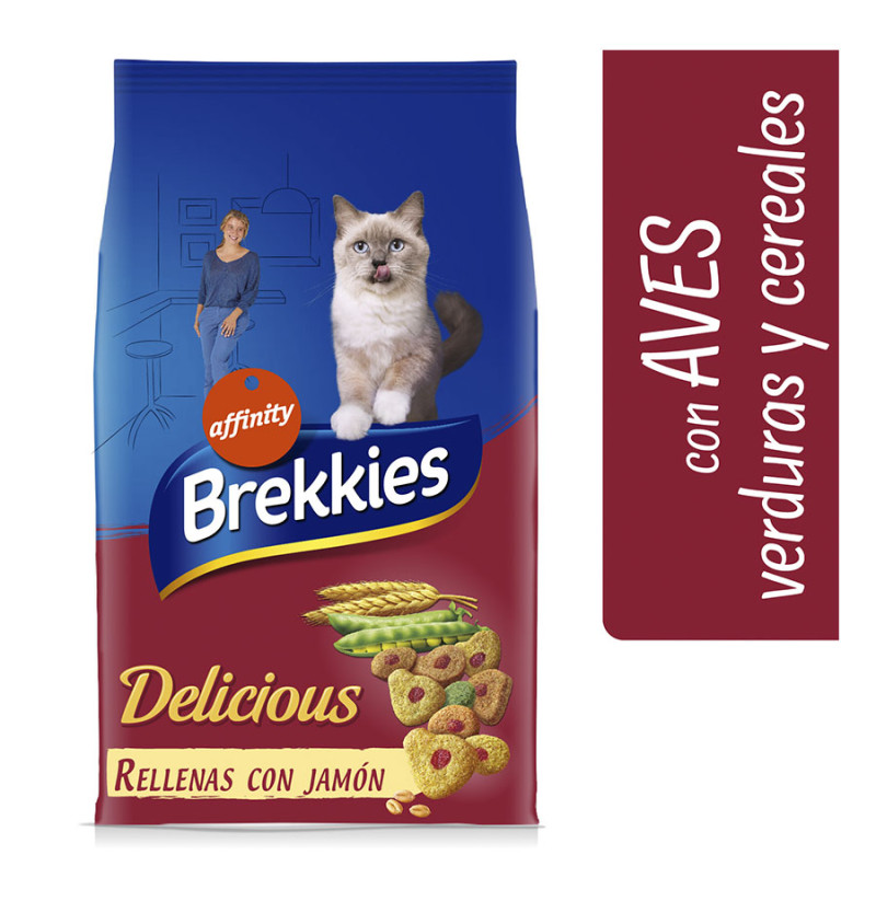 Brekkies Delicious es un irresistible alimento que sorprende por su crujiente textura y sus croquetas rellenas con jamón, que harán de la comida diaria de tu gato un auténtico placer.