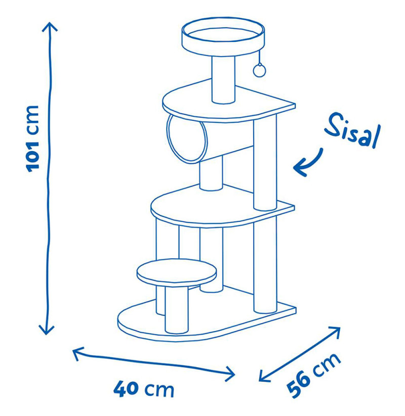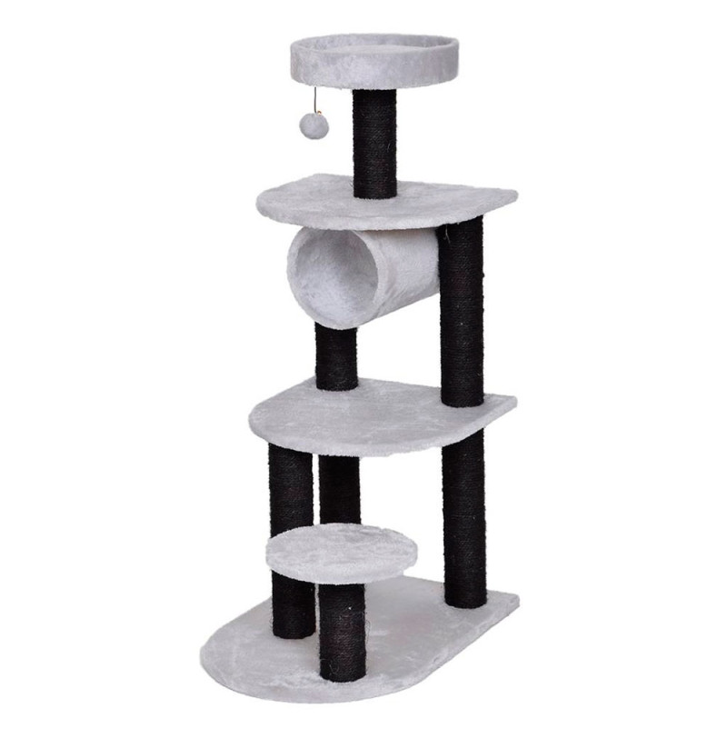 El Rascador Adrien Gris y Negro le permite a tu gato jugar y relajarse. Tu gato puede coger sitio en la plataforma superior para disfrutar de unas maravillosas vistas del entorno, jugar en las plataformas y con la pelota. También dispone de un poste con sisal para que tu gato se afile las uñas y no te destroce los muebles de la casa con sus uñas. Contiene un túnel, en el que tu gato puede reptar y divertirse. Las suaves plataformas le ofrecen la máxima comodidad a tu gato.
