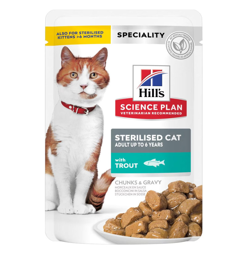 Hill's Science Plan Sterilised Cat alimento para gatos adultos con trucha es un alimento completo para gatos esterilizados de 6 meses a 6 años de edad.