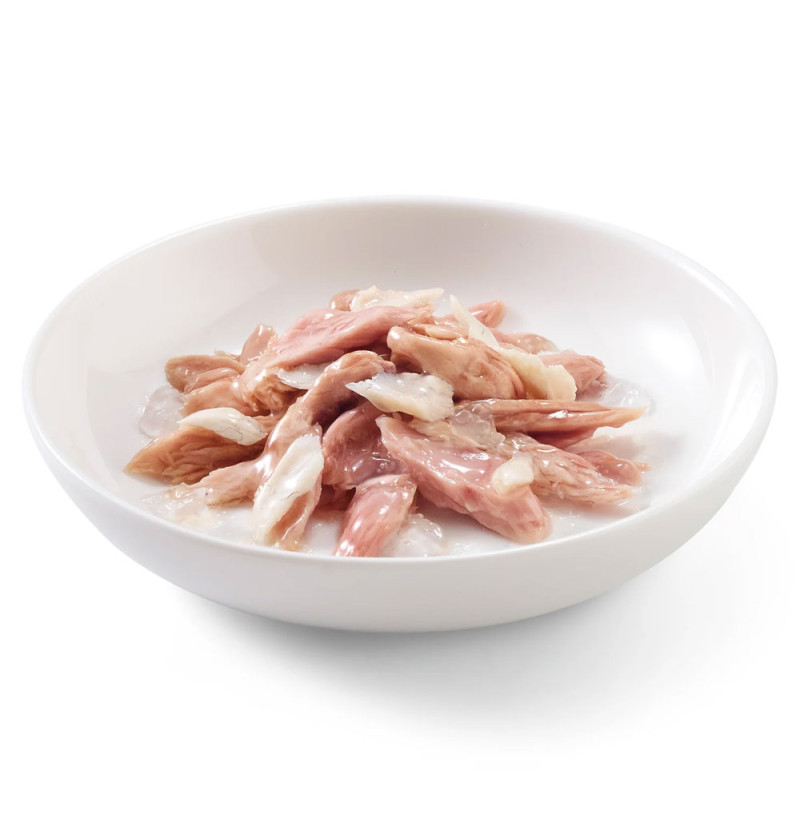 La receta se basa en auténticos filetes de atún combinados con merluza, un pescado conocido por su carne blanca, magra y delicada. Viene en gelatina para satisfacer los gustos de los gatos que aman los sabores del mar combinados con una consistencia más sólida en el bol.