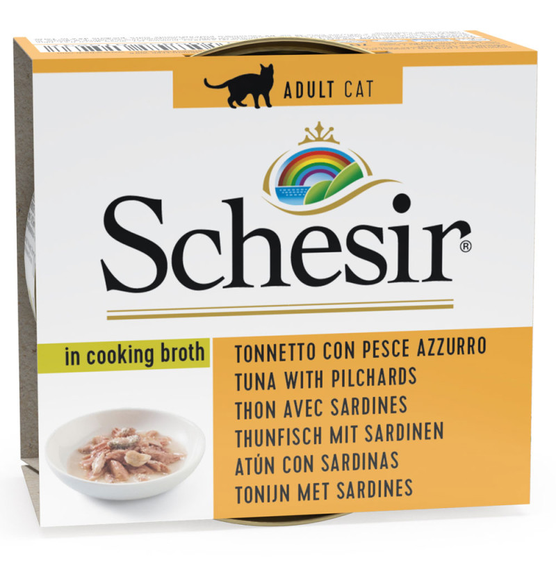 SCHESIRSchesir Lata de filetes de Atún con Pescado Azul (sardinas) en caldo para gatos