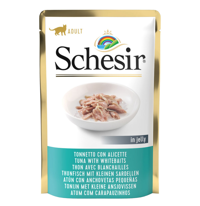 La receta Schesir tiene como ingrediente principal auténticos filetes de delicioso atún combinados con apetitosas y sabrosas anchoas. La preparación se realiza en gelatina para satisfacer los gustos de aquellos gatos que prefieren los sabores de mar, combinados con una textura más densa en el bol.