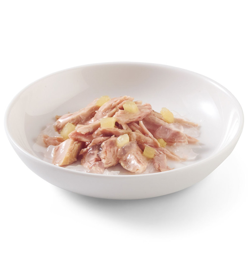 Receta de auténticos filetes de delicioso atún, combinados con auténticos trozos de delicada manzana para ofrecer una comida deliciosa. La preparación se realiza en gelatina para satisfacer los gustos de aquellos gatos que prefieren un sabor natural, combinado con una textura más densa en el bol.