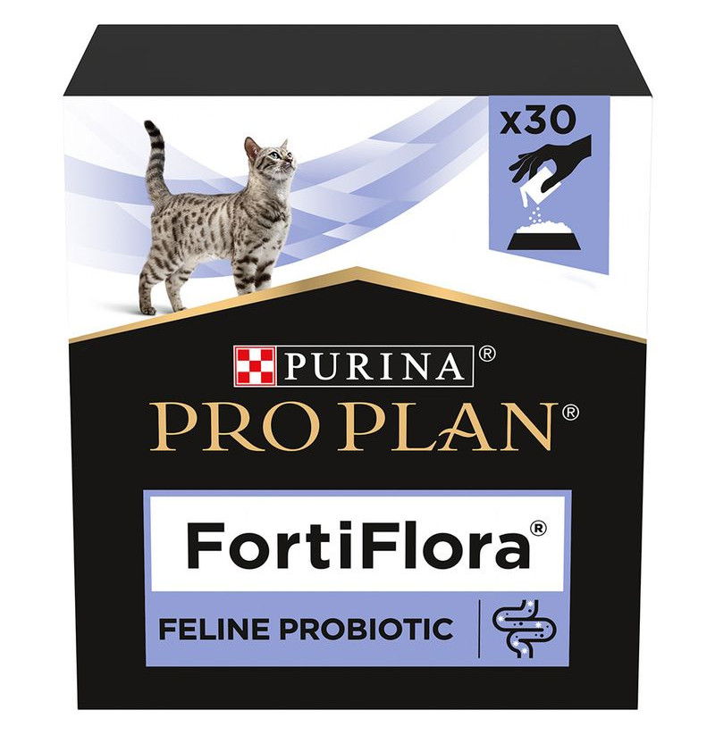 Suplemento probiótico FortiFlora para gatos. Mejora la salud digestiva y refuerza el sistema inmunitario. Caja de 30 sobres