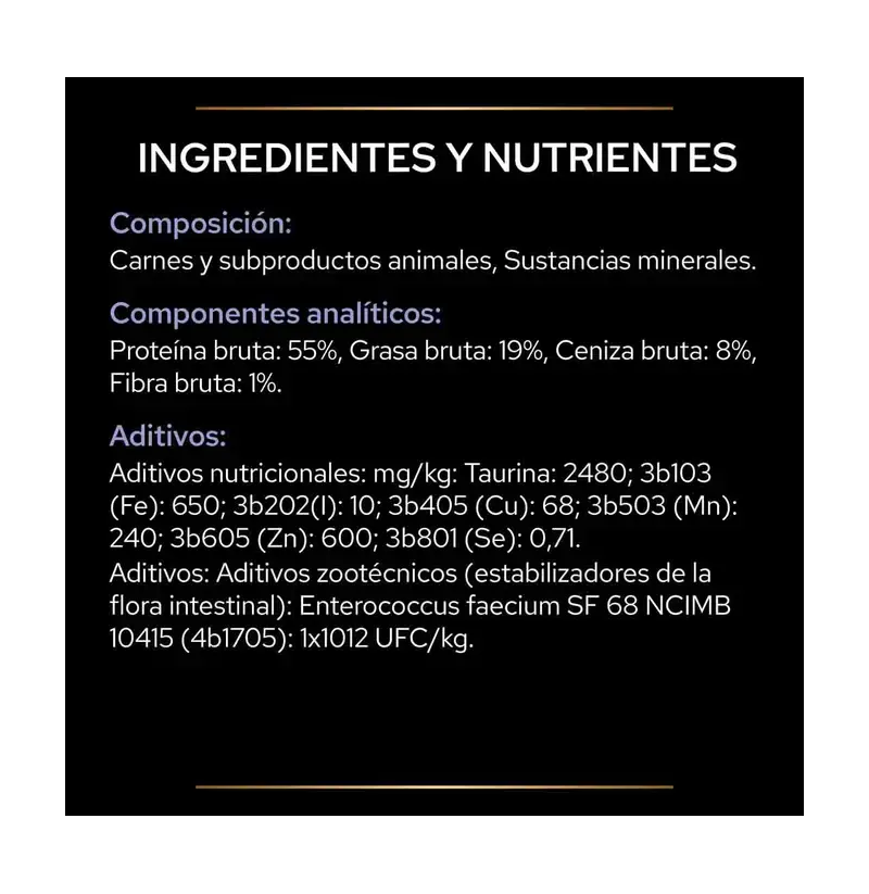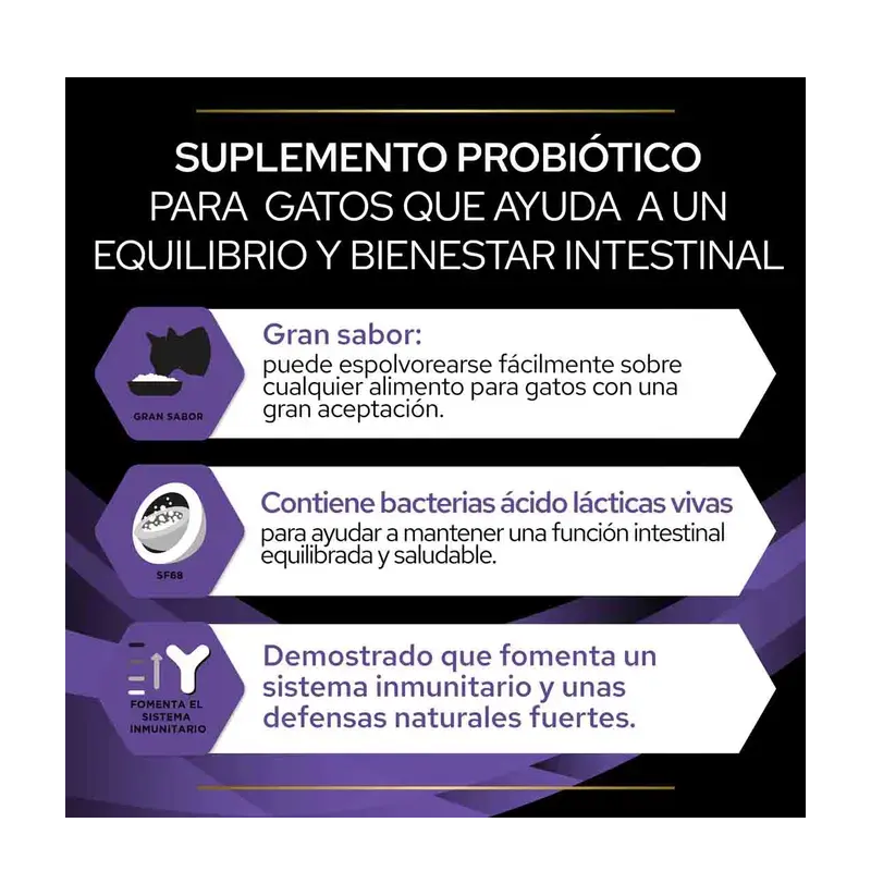 Contiene cepas específicas de Enterococcus faecium con eficacia demostrada para restaurar el equilibrio intestinal y favorecer un sistema digestivo saludable. También refuerza el sistema inmunitario, ayudando al gato a estar más fuerte frente a infecciones.