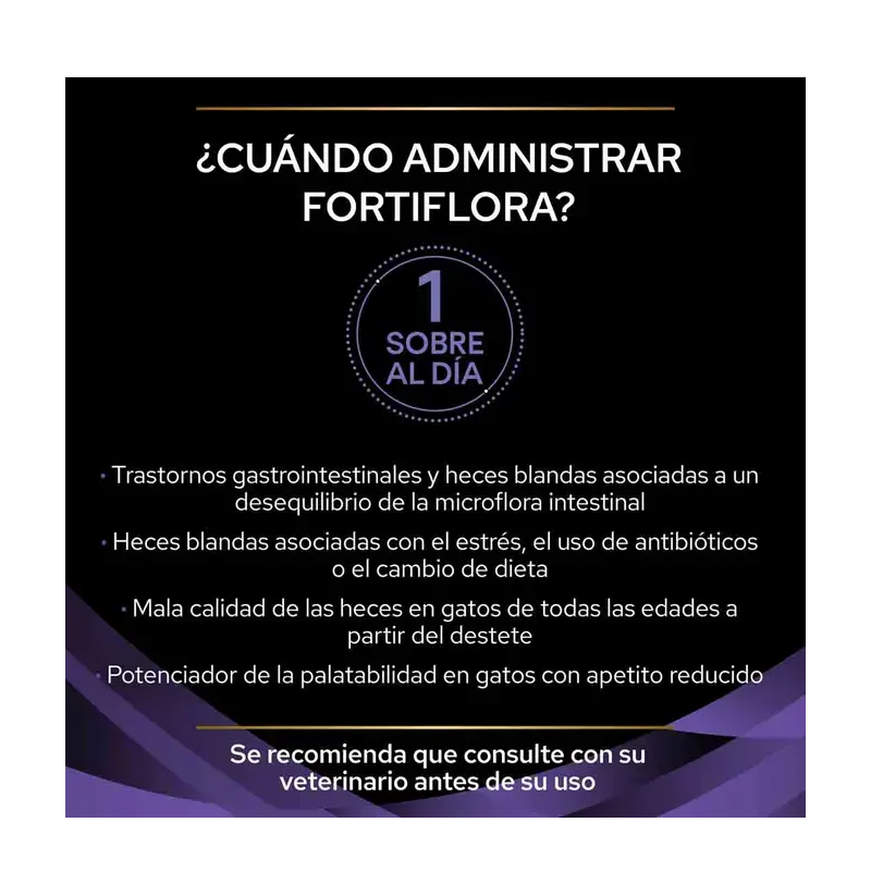 FortiFlora Gatos de Purina es un suplemento probiótico en formato polvo, formulado específicamente para mejorar la flora intestinal de los gatos y ayudar en casos de diarrea, trastornos digestivos o tras tratamientos antibióticos.