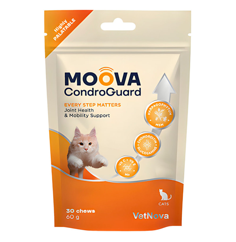 Vetnova Moova Condroguard Cats (chews) es un suplemento condroprotector para gatos. Alimento Complementario Formulado en Chews y en Comprimidos de Alta Palatabilidad con Glucosamina, Condroitín sulfato, Harpagofito y Antioxidantes. Indicado para Ayudar a Mantener una Óptima Movilidad y Calidad de Vida en Gatos