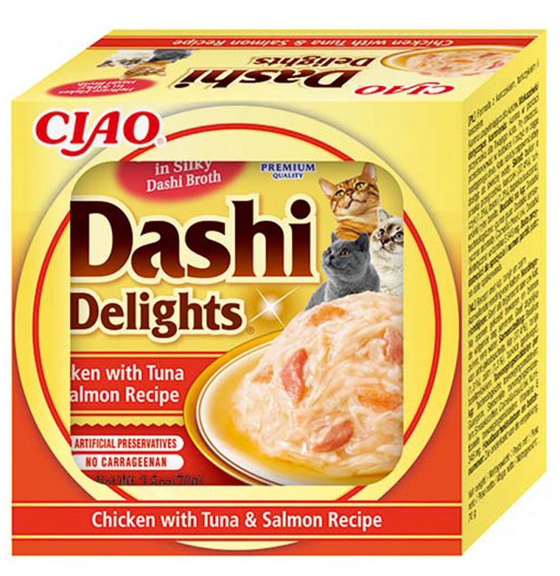 Churu Cat Dashi Pollo con Atún y Salmón es una comida húmeda premium que combina pollo de granja, atún salvaje y salmón en un sabroso caldo japonés dashi. Diseñada como alimento complementario, esta receta es ideal para gatos exigentes, aportando hidratación adicional y un sabor umami irresistible.