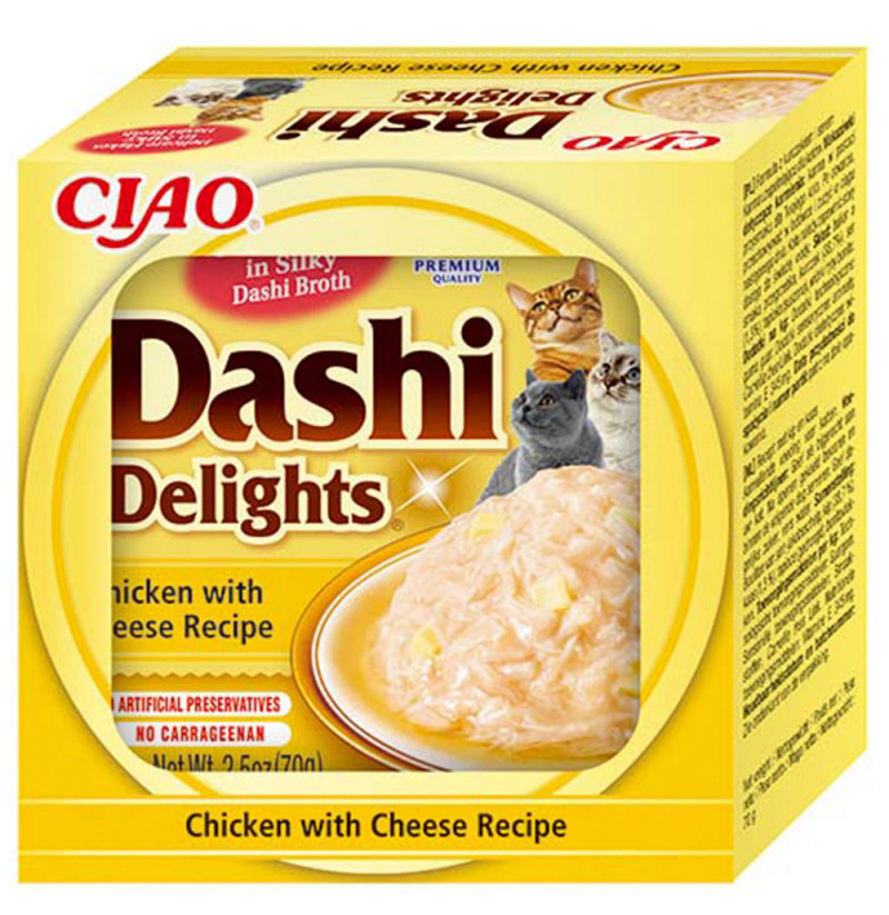 Churu Cat Dashi Pollo con Queso es una comida húmeda premium que combina pollo de granja y queso en un sabroso caldo japonés dashi. Diseñada como alimento complementario, esta receta es ideal para gatos exigentes, aportando hidratación adicional y un sabor umami irresistible.