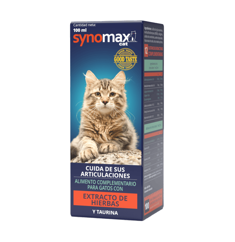 Synomax Cat es un suplemento dietético líquido diseñado para mejorar la salud articular de los gatos. Su fórmula combina 12 sustancias bioactivas que actúan sinérgicamente para regenerar el cartílago, aliviar el dolor y reducir la inflamación, promoviendo una mayor movilidad y bienestar en gatos de todas las edades.