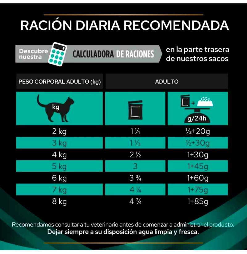Sobre de 85 g. Puede administrarse hasta 12 semanas o prolongarse en casos crónicos, bajo supervisión veterinaria. Dejar siempre agua fresca disponible.