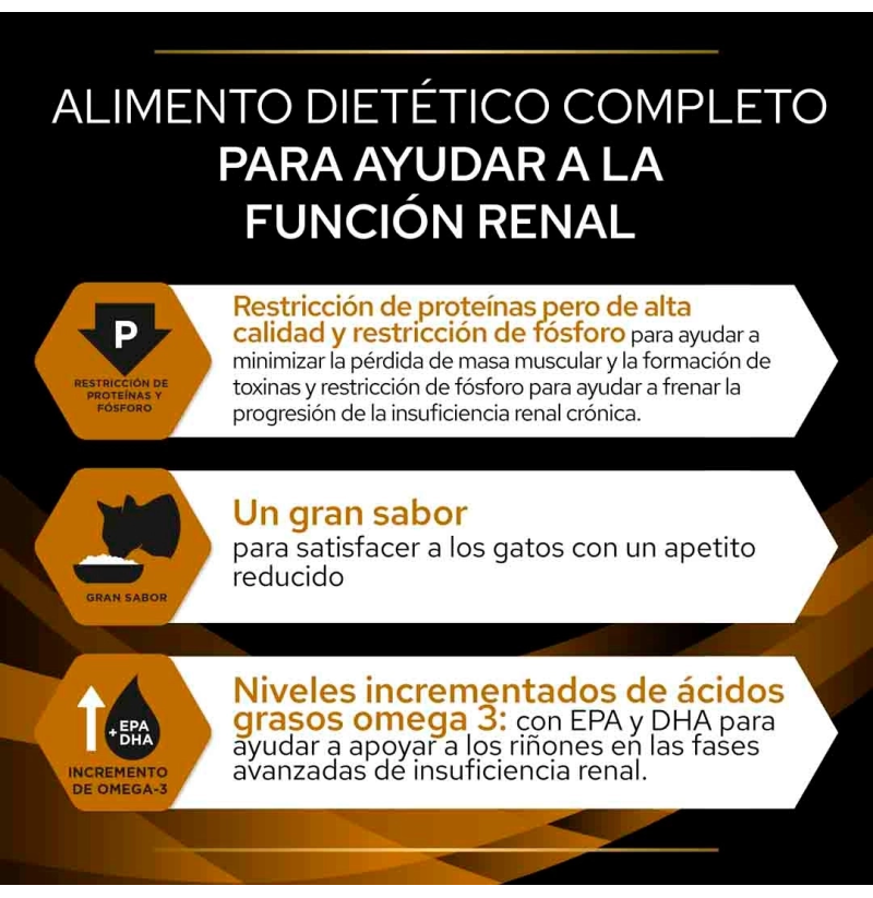 https://tienda.todomascota.es/gatos/29970-pro-plan-latas-renal-function-mousse-para-gatos-8445290030511.html#/cantidad-24_x_195gPUR12603125Pro Plan Latas Renal Function Mousse para gatos<h2>Pro Plan Veterinary Diets Feline NF Renal Function Mousse (195 g)</h2> <p><strong>Purina Pro Plan Veterinary Diets Feline NF Renal Function</strong> en textura <strong>mousse húmeda (195 g)</strong> es un alimento dietético completo formulado para gatos con <strong>insuficiencia renal crónica avanzada (IRIS estadio 3‑4)</strong>.</p> <h3 style="margin-top: 15px;"><strong>Beneficios clínicos</strong></h3> <ul> <li><strong>Proteína restringida de alta calidad:</strong> para preservar masa muscular y reducir toxinas renales.</li> <li><strong>Bajo fósforo (0,09 %):</strong> ayuda a frenar la progresión de la enfermedad renal.</li> <li><strong>Omega‑3 (EPA +DHA 0,14 %):</strong> favorece la función renal e inflamación.</li> <li><strong>Gran palatabilidad:</strong> ideal para gatos con apetito débil.</li> </ul> <h3 style="margin-top: 15px;"><strong>Componentes analíticos exactos</strong></h3> <ul> <li>Humedad – 79 %</li> <li>Proteína bruta – 7 %</li> <li>Grasa bruta – 9,1 %</li> <li>Ceniza bruta – 2 %</li> <li>Fibra bruta – 0,02 %</li> <li>Calcio – 0,23 %</li> <li>Fósforo – 0,09 %</li> <li>Potasio – 0,44 %</li> <li>Sodio – 0,06 %</li> <li>Ácidos grasos omega‑3 (EPA +DHA) – 0,14 %</li> </ul> <h3 style="margin-top: 15px;"><strong>Ingredientes exactos</strong></h3> <p>Hígado de cerdo; pavo; corazón e hígado de aves; salmón; grasa de cerdo; harina de arroz; sustancias minerales; aceite de girasol; aceite de pescado; azúcares.</p> <h3 style="margin-top: 15px;"><strong>Aditivos nutricionales (por kg)</strong></h3> <ul> <li>Vitamina A – 1 980 UI</li> <li>Vitamina D₃ – 276 UI</li> <li>Vitamina E – 300 mg</li> <li>Hierro – 18 mg</li> <li>Yodo – 0,72 mg</li> <li>Cobre – 1,8 mg</li> <li>Manganeso – 3,3 mg</li> <li>Zinc – 34,9 mg</li> <li>Selenio – 0,13 mg</li> <li>Taurina – 1 204 mg</li> </ul> <h3 style="margin-top: 15px;"><strong>Modo de uso y presentación</strong></h3> <p>Formato mousse de <strong>195 g</strong>, indicado para alimentación durante hasta 6 meses o más en caso crónico, bajo supervisión veterinaria. Dejar siempre disponible agua fresca.</p> <p><em>Alimento dietético clínico de prescripción veterinaria. Consulta con tu veterinario antes de iniciar o prolongar su uso.</em></p>https://tienda.todomascota.es/61652-large_default/pro-plan-latas-renal-function-mousse-para-gatos.jpg69.384instockPURINA PRO PLAN70.863.076421.28732025-07-18T10:01:38+0200/Gatos/Gatos/Alimentación para gatos/Gatos/Alimentación para gatos/Dietas gatos/Gatos/Alimentación para gatos/Dietas gatos/Dieta Renal gatos/Gatos/Alimentación para gatos/PROPLAN gatos/Gatos/Alimentación para gatos/PROPLAN gatos/Dietas ProPlan gatos