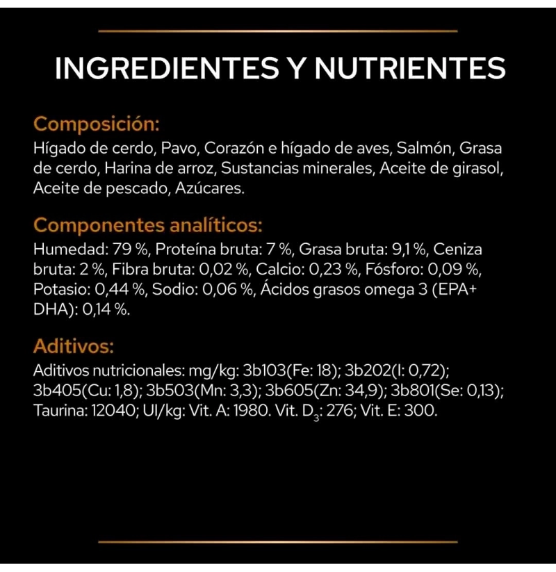 Hígado de cerdo; pavo; corazón e hígado de aves; salmón; grasa de cerdo; harina de arroz; sustancias minerales; aceite de girasol; aceite de pescado; azúcares.