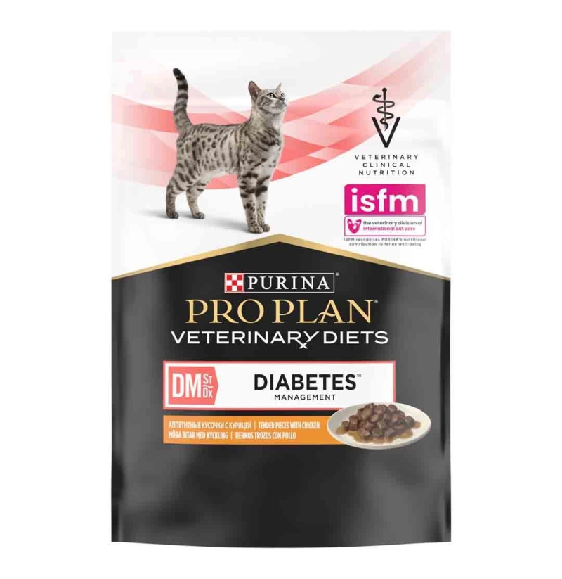 Purina Pro Plan Veterinary Diets Feline DM Diabetes Management en formato sobre (85 g) es un alimento dietético completo formulado para: