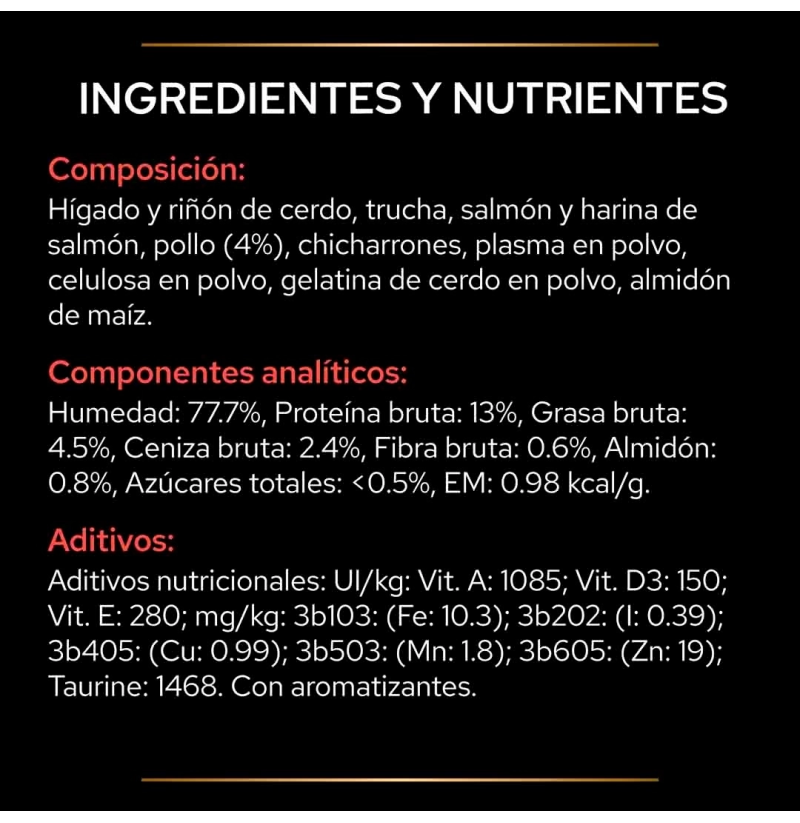 https://tienda.todomascota.es/gatos/29973-pro-plan-diabetes-sobres-pollo-para-gatos-8445290093493.html#/cantidad-10_x_85gPUR12572283Pro Plan Diabetes Sobres Pollo para gatos<h2>Pro Plan Veterinary Diets Feline DM Diabetes Management – Sobres Pollo (85 g)</h2> <p><strong>Purina Pro Plan Veterinary Diets Feline DM Diabetes Management</strong> en formato sobre (85 g) es un alimento dietético completo formulado para:</p> <ul> <li>Regular la glucosa en gatos con diabetes mellitus</li> <li>Reducir las variaciones de azúcar post‑prandiales</li> <li>Disminuir la dependencia de insulina</li> </ul> <h3 style="margin-top: 15px;"><strong>Beneficios clínicos</strong></h3> <ul> <li><strong>Bajo en carbohidratos y azúcares totales (~0,02 %):</strong> favorece niveles glucémicos estables</li> <li><strong>Alto en proteínas (≈13 %)</strong>: mantiene la masa muscular</li> <li><strong>Vitamina E elevada (≈173 mg/kg):</strong> reduce el estrés oxidativo</li> <li><strong>Textura en salsa:</strong> muy palatable para gatos exigentes</li> </ul> <h3 style="margin-top: 15px;"><strong>Componentes analíticos exactos</strong></h3> <ul> <li>Humedad – 77 %</li> <li>Proteína bruta – 13 %</li> <li>Grasa bruta – 5,5 %</li> <li>Fibra bruta – 0,8 %</li> <li>Almidón – < 0,35 %</li> <li>Azúcares totales – 0,02 %</li> <li>Ácidos grasos esenciales – 1,36 %</li> <li>Omega‑6 – 0,8 %</li> <li>Omega‑3 – 0,4 %</li> <li>Energía metabolizable – 0,97 kcal/g</li> </ul> <h3 style="margin-top: 15px;"><strong>Ingredientes exactos</strong></h3> <p>Según Purina:</p> <ul> <li>Hígado y riñón de cerdo</li> <li>Trucha</li> <li>Salmón y harina de salmón</li> <li>Pollo</li> <li>Chicharrones</li> <li>Plasma en polvo</li> <li>Celulosa en polvo</li> <li>Gelatina de cerdo en polvo</li> <li>Almidón de maíz</li> </ul> <h3 style="margin-top: 15px;"><strong>Aditivos nutricionales</strong></h3> <ul> <li>Vitamina E – ≈173 mg/kg</li> </ul> <h3 style="margin-top: 15px;"><strong>Modo de uso y presentación</strong></h3> <p>Formato sobre individual de <strong>85 g</strong>. Utilización recomendada por veterinario durante hasta 6 meses. Ajustar ración al combinar con pienso seco. Dejar siempre agua fresca disponible.</p> <p><em>Alimento dietético de prescripción veterinaria. Consulte con su veterinario antes de iniciar o modificar su uso.</em></p>https://tienda.todomascota.es/61668-large_default/pro-plan-diabetes-sobres-pollo-para-gatos.jpg16.6502instockPURINA PRO PLAN16.9915.136520.30892025-07-18T11:03:43+0200/Gatos/Gatos/Alimentación para gatos/Gatos/Alimentación para gatos/Gama veterinaria para gatos/Gatos/Alimentación para gatos/Gama veterinaria para gatos/Gama veterinaria comida para gatos húmeda/Gatos/Alimentación para gatos/Dietas gatos/Gatos/Alimentación para gatos/Dietas gatos/Dieta Diabetes gatos/Gatos/Alimentación para gatos/PROPLAN gatos/Gatos/Alimentación para gatos/PROPLAN gatos/Dietas ProPlan gatos