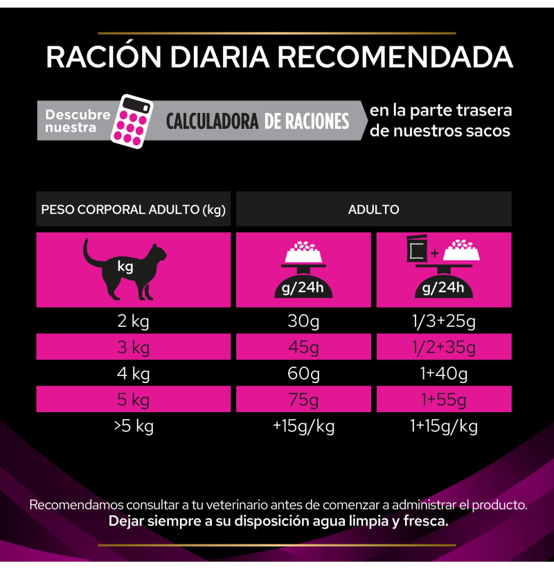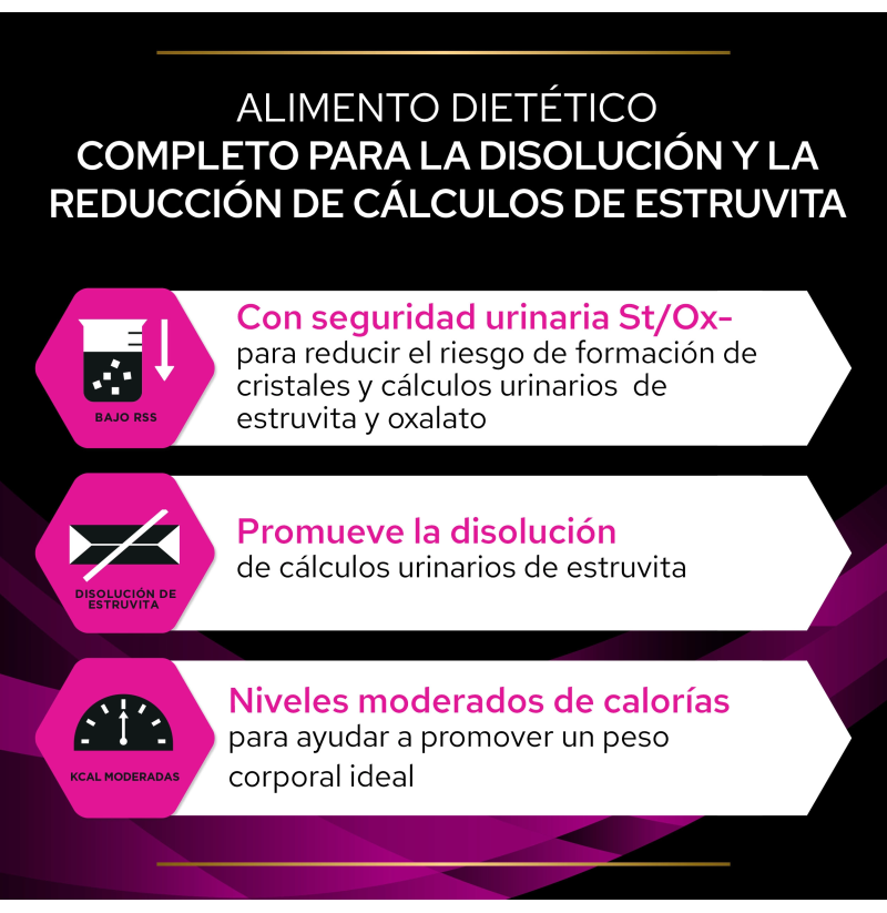 - Pienso seco: alta concentración de St/Ox y nutrientes para salud urinaria.