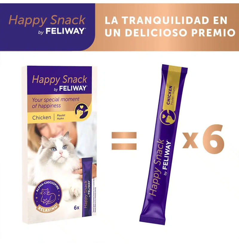 Feliway Happy Snack con Pollo es un exquisito snack cremoso para gatos, presentado en cómodos sobres para lamer que combinan placer y bienestar en cada bocado. Con sabor a pollo muy apreciado por los felinos, este complemento delicioso también incluye alfa-casozepina, una proteína láctea con potencial efecto calmante, ideal para momentos estresantes o rutinas agitadas.