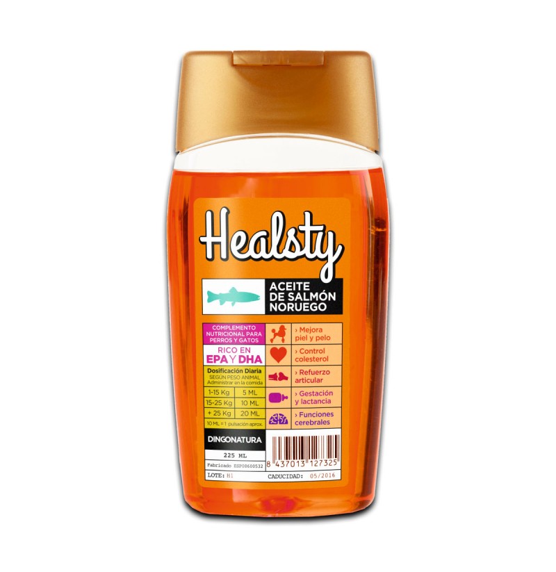 DINGO NATURAAceite de salmón noruego Healsty, es un aceite de salmón fresco, procesado en frío, procedente de Noruega, rico en Astaxantina y con un aporte extra de ácidos grasos omega·, especialmente DHA y EPA.