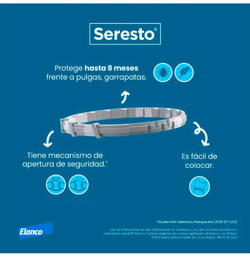 El collar antiparasitario Seresto para gatos es un medicamento veterinario externo que ofrece protección prolongada contra pulgas, garrapatas y piojos, gracias a su fórmula con liberación controlada de principios activos. Está indicado para gatos desde las 10 semanas de edad y proporciona eficacia durante 7-8 meses si se lleva colocado de forma continua.
