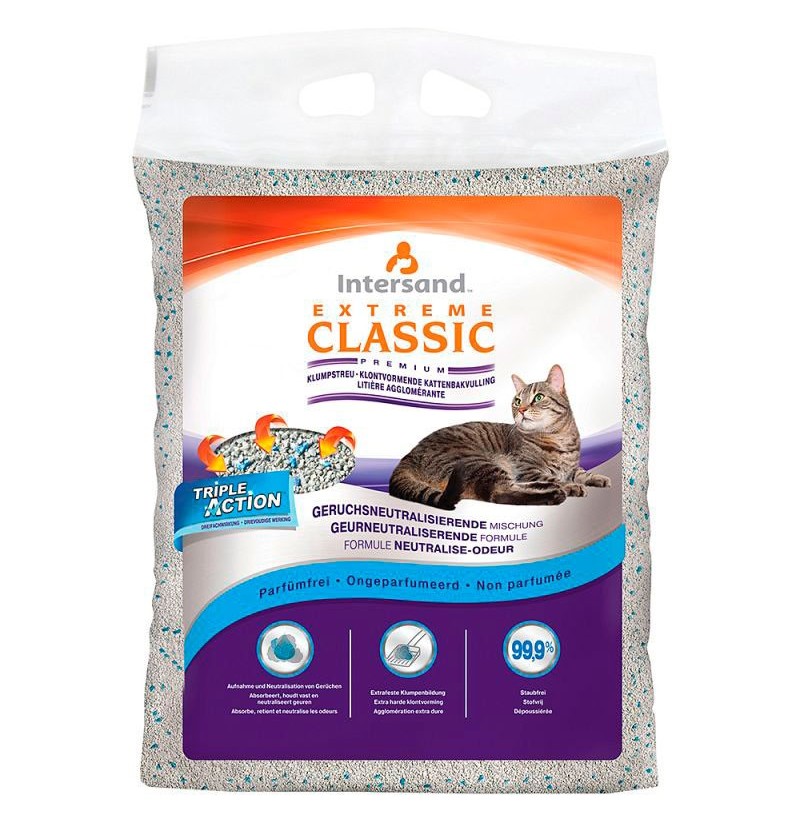 La arena aglomerante para gatos Intersand Extreme Classic presenta una nueva y exclusiva triple acción patentada (TRIPLE ACTION™) para eliminar los malos olores de una forma todavía más efectiva.