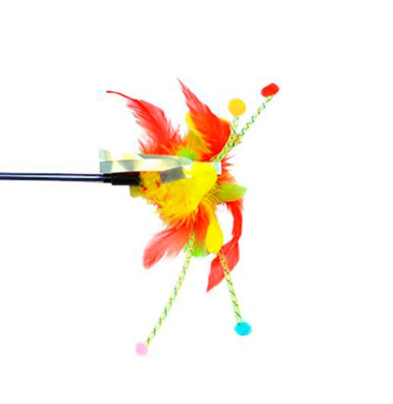 Juguete extremadamente divertido para gatos. Este palo o vara con plumas de diversos colores, tiras brillantes y antenas con bolas volverá loco a tu gato ofreciéndole horas de diversión. Apto para gatitos y gatos sensibles.