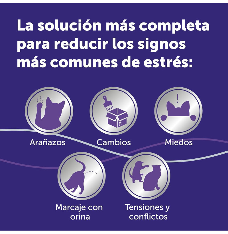 Perfecto para múltiples situaciones estresantes: mudanzas, introducción de nuevos gatos, cambios en el hogar, tensiones entre felinos, miedos y marcajes con orina.