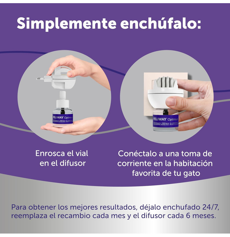 Solo conecta el difusor, deja que libere feromonas durante 30 días (cobertura hasta 70 m²), y reemplaza el recambio mensualmente. Seguro para todas las etapas de vida y sin efectos secundarios farmacológicos.