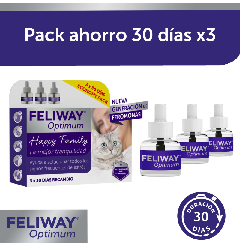 Feliway® Optimum presenta un nuevo complejo de feromonas felinas que reduce los signos comunes de estrés en gatos—como arañazos, micciones inapropiadas y conflictos entre felinos—en tan solo 7 días. Clinicamente probado con satisfacción del 93 % de los usuarios.