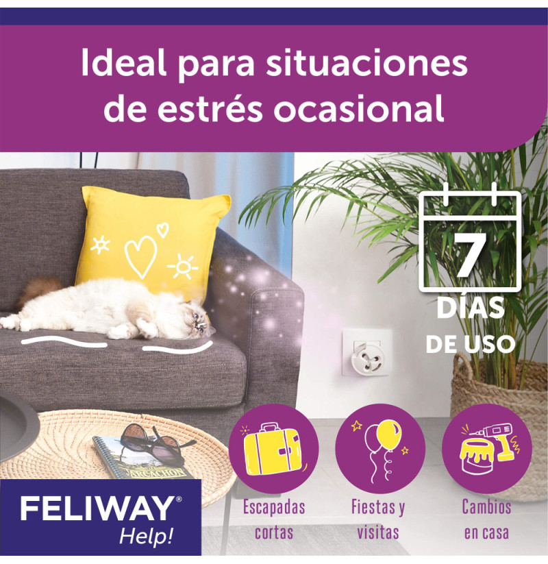 Feliway Help! es un difusor de feromonas sintéticas ideal para situaciones estresantes ocasionales en gatos como viajes, visitas o celebraciones. Proporciona calma rápida durante 7 días.