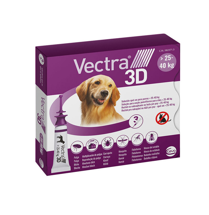Las pipetas Vectra 3D para perros ofrecen protección eficaz para perros contra pulgas, garrapatas, mosquitos, flebótomos y moscas del establo