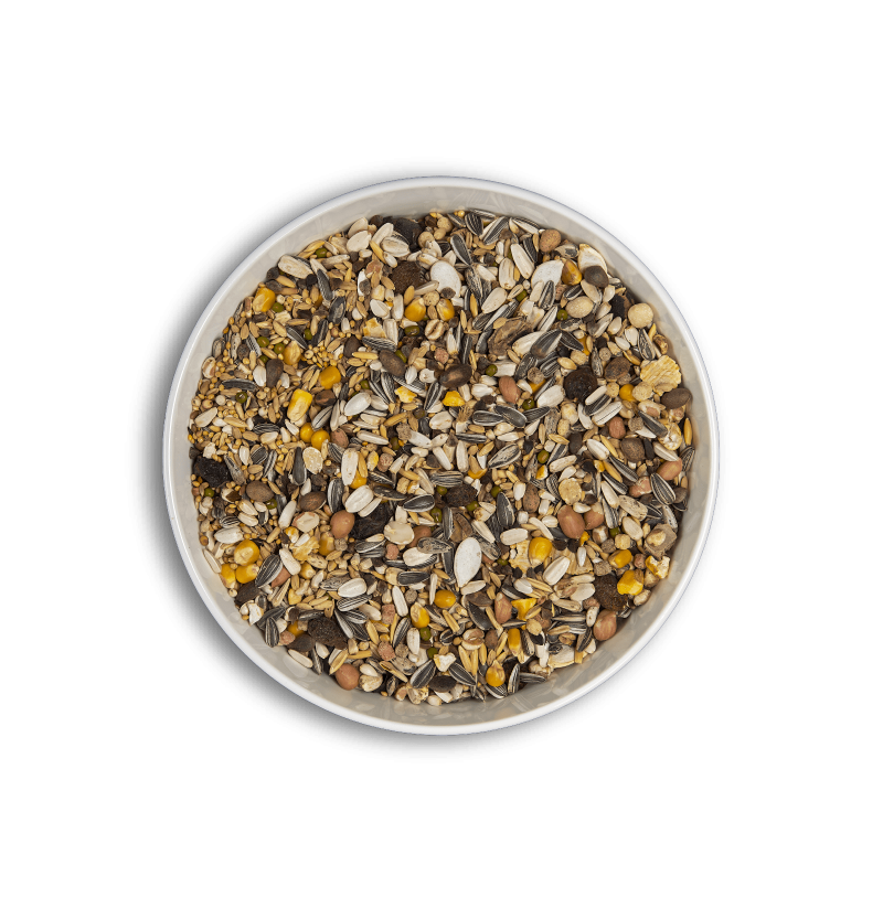 Composición: Semilla de girasol, alazor, arroz con cáscara, alforfón, avena, maíz plata, mijo amarillo, semilla de girasol blanca, soja verde, alpiste, cacahuete sin cáscara, cebada, avena pelada, arroz, gránulos extrusionados, frutos silvestres, cáñamo, piñones, maíz desgranado, semilla de calabaza, pan de St. John’s, pasas, copos de guisante, arroz hinchado, grit.