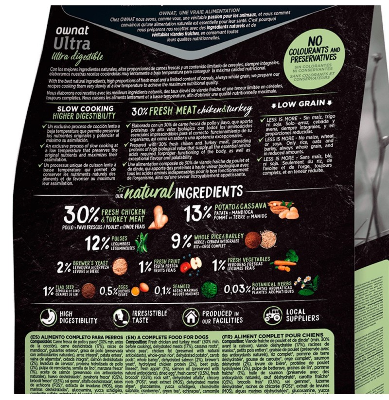 El pienso Ownat Ultra Mini Adult Pollo y Pavo fresco cuenta con el exclusivo cocinado a cocción lenta hace que sea irresistible y a la vez, se preserven los nutrientes originales potenciando así su asimilación.