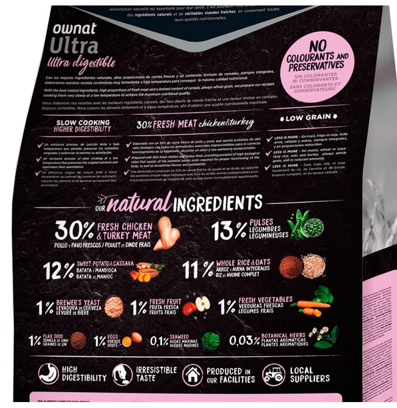 La combinación de Pollo y Pavo fresco del pienso Ownat Ultra Medium Sterilized junto con el proceso exclusivo de cocción lenta hace que sea irresistible y a la vez, se preserven los nutrientes originales potenciando así su asimilación.