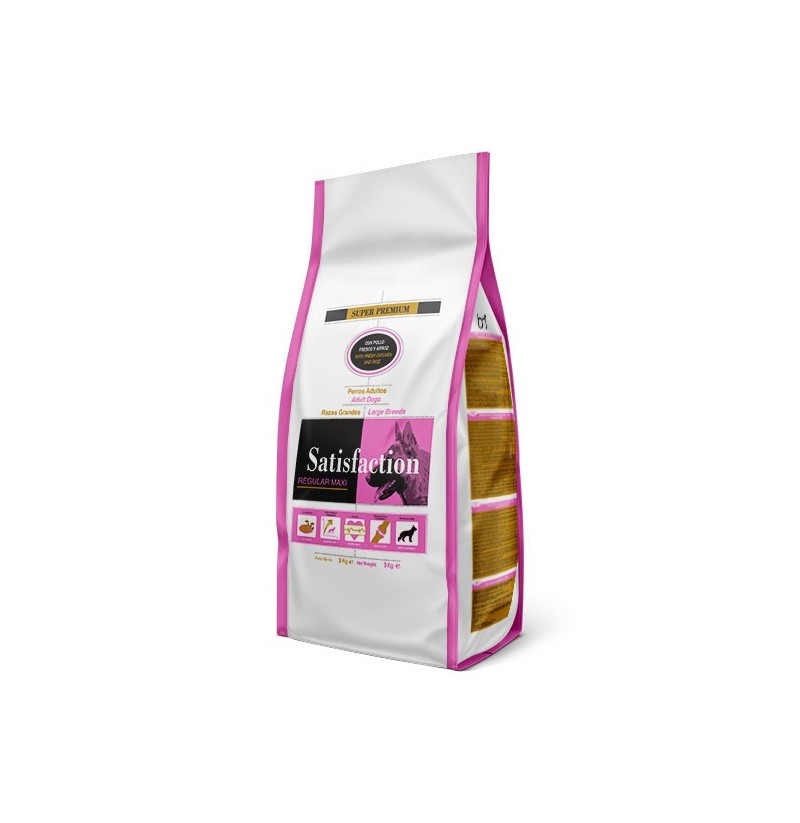 Satisfaction Regular Maxi es un pienso de croqueta grande de rico sabor a pollo y arroz formulado para ser una dieta sana, equilibrada y de alta digestibilidad.